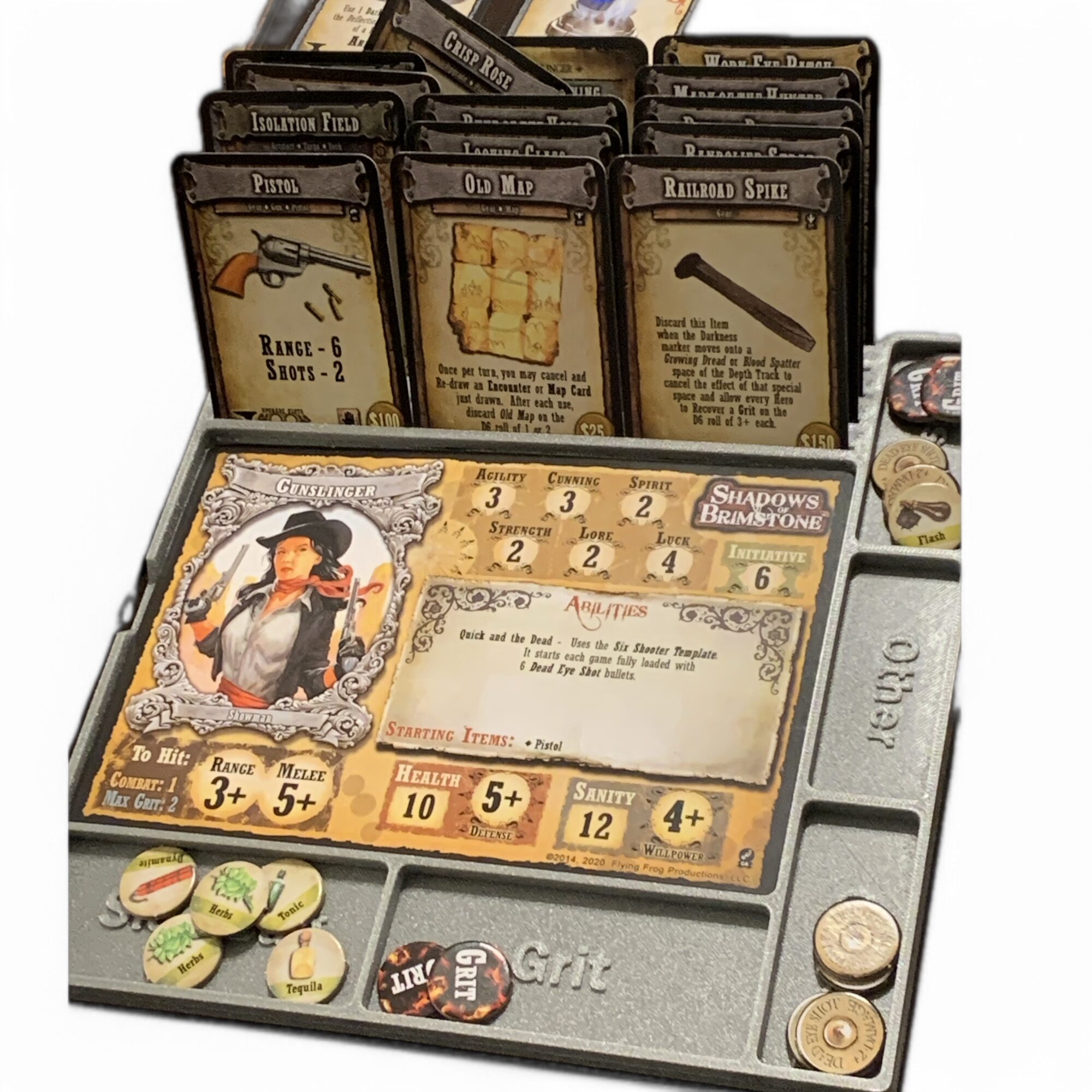 This player station allows for the easy containment of and ability to move your chits, cards, and other game items. Display your cards where you can read them. Place your character card and or use the center section as a dice tray. Individual compartments keep your tokens separate and easily located.